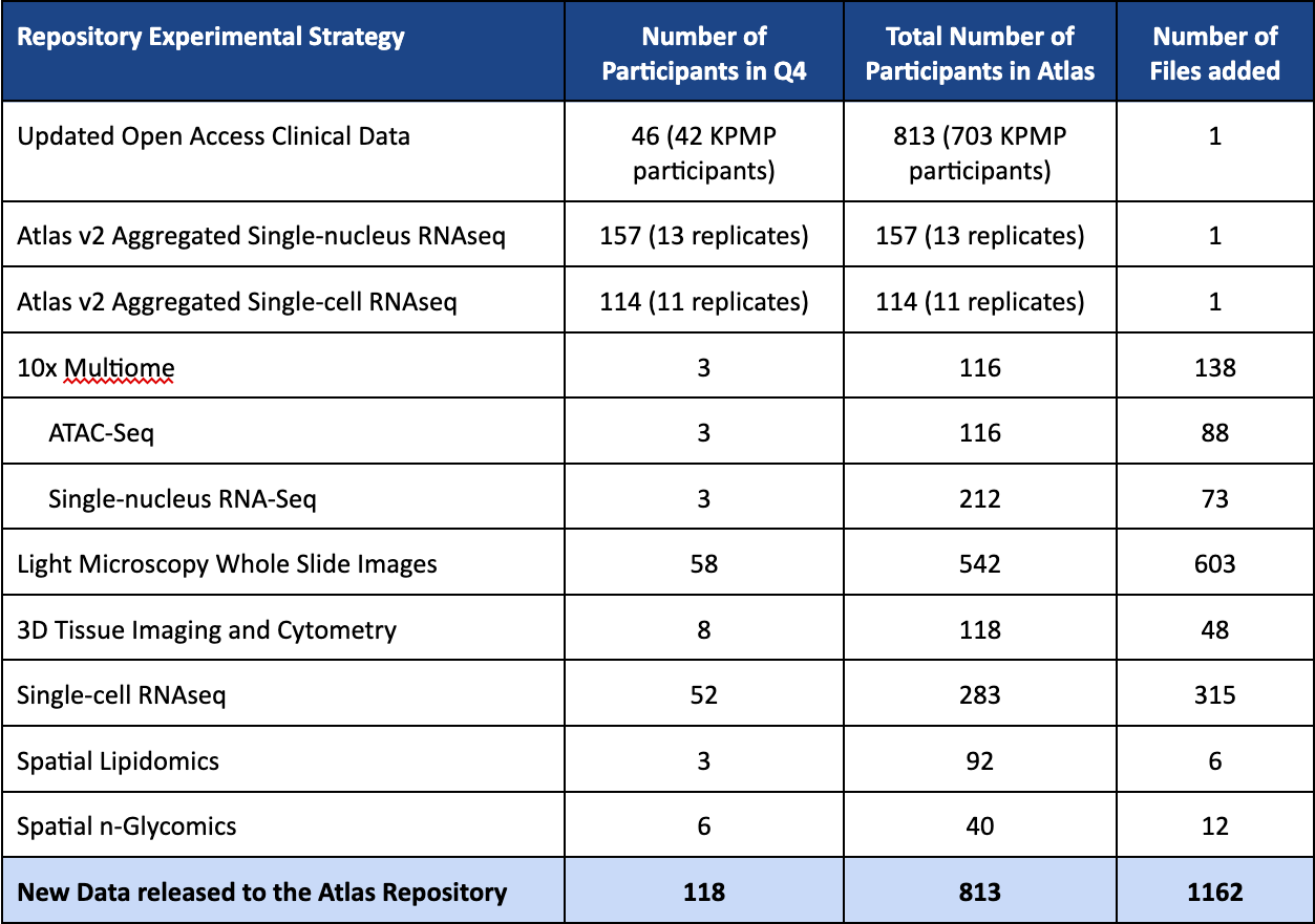 The Atlas Repository provides access to the dataset files being generated by KPMP. The datasets available in the repository are a combination of raw and processed data from KPMP participant biopsies and reference tissue samples. Datasets are routinely added as they are generated and have completed a quality control process. Some data files shown in the repository are "controlled access", meaning they can only be retrieved after a data use agreement is in place between KPMP and your organization. A summary of the data available in the repository is available on the Kidney Tissue Atlas homepage.